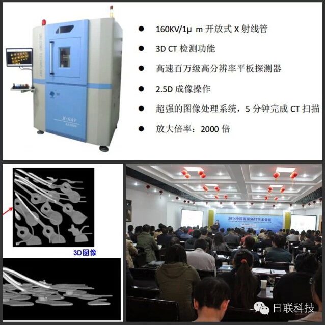 作為電子制造業(yè)X射線智能檢測(cè)裝備領(lǐng)航者,日聯(lián)科技受邀參會(huì),西北片區(qū)經(jīng)理劉嵐發(fā)表題為《X射線3D 智能檢測(cè)技術(shù)》之專題報(bào)告。眾所周知,隨著電子產(chǎn)品集成度越來(lái)越高、元器件的封裝越來(lái)越小、且在板上的分布密度愈來(lái)愈密,其生產(chǎn)加工工藝變得愈加復(fù)雜,焊接質(zhì)量的保障迎來(lái)新的挑戰(zhàn),加之傳統(tǒng)的表面光學(xué)檢查及ICT測(cè)試都有各自的檢測(cè)盲區(qū),因此具有穿透檢測(cè)功能的X光檢查作為電子產(chǎn)品質(zhì)量檢測(cè)必不可少的關(guān)鍵技術(shù)就顯得尤為重要。特別是當(dāng)今智能電子產(chǎn)品上廣泛使用的PoP疊層封裝焊接質(zhì)量檢測(cè),具有3D CT功能的X射線智能裝備就大顯神通了。報(bào)告中重點(diǎn)介紹X射線的激發(fā)/成像原理、三維CT技術(shù)的檢測(cè)優(yōu)勢(shì)、以及結(jié)合日聯(lián)科技**研發(fā)的國(guó)內(nèi)首臺(tái)160KV/1μm微聚焦3D CTX-ray機(jī)器AX3000的智能檢測(cè)技術(shù)及優(yōu)越的軟件性能給聽眾進(jìn)行一一報(bào)告。為廣大電子制造企業(yè)提供工藝優(yōu)化和質(zhì)量提升的新技術(shù)和新方案,受到現(xiàn)場(chǎng)嘉賓的廣泛關(guān)注。