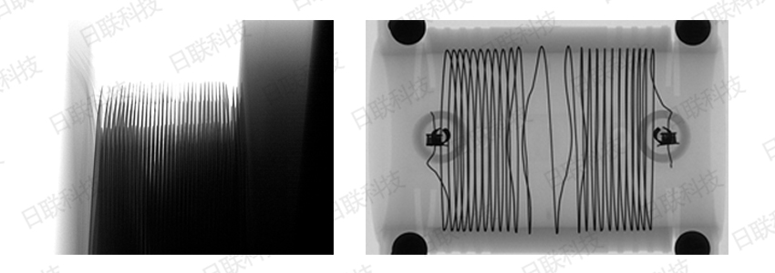 充電時(shí),鋰離子從正極中出來,經(jīng)過電解液,穿過隔膜到達(dá)負(fù)極,放電時(shí)則相反。它們通過繞卷或堆疊的方式組合成一個鋰電池,X射線檢測可以清晰的看到鋰電池中繞卷和堆疊的對齊程度,正負(fù)極極耳的焊接是否存在虛焊等問題,這些都可能引起電池使用過程中的短路。